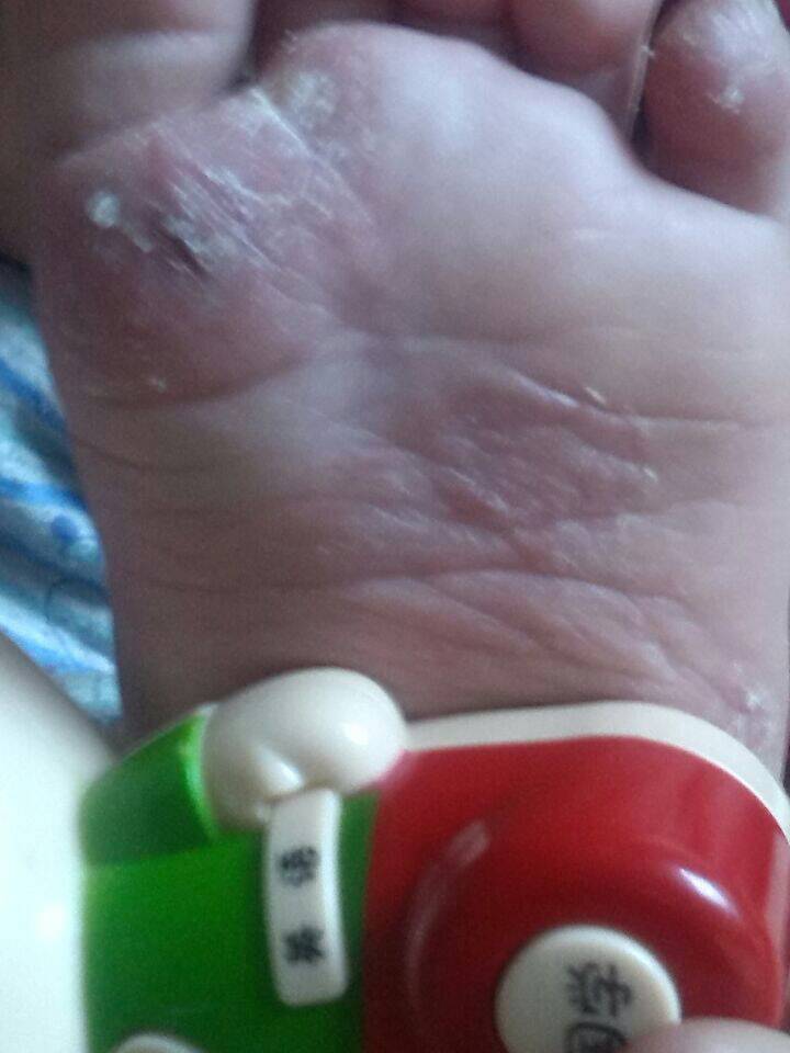两岁小孩,女性,脚底一妥一妥的起皮,之前身上有过湿疹去医院开的药膏涂上都好了,脚底也涂了好几次不当