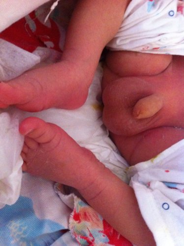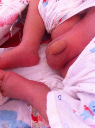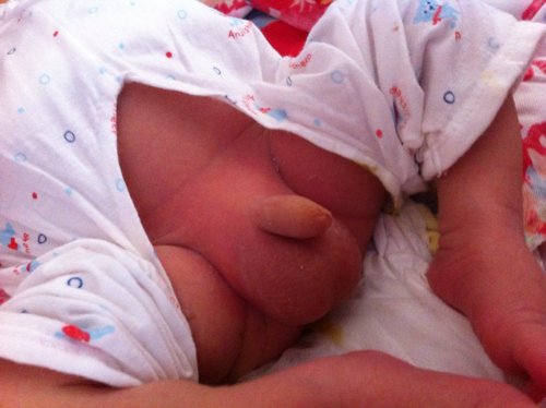 ,姜等东西)导致宝宝(宝宝吃母乳)体寒蛋蛋肿了。求助。有谁懂的帮忙看一下。这个是有积液?还是单纯的肿了?我看不出来。如果是积液该怎么做。。是不是真像婆婆说的那样?因为我有高血压不能吃些太补燥热的东西!!