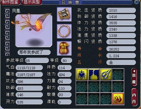 高级凤凰 是血敏宝富菜宝宝 低级的 又不是4技能的 认证冲 而且还是80级了 69 带不了 89有老鼠 95有吸血鬼 105 女娲 画魂 不过寿挎过命真变态 法资防资 还可以 成长也满了 大生查概250 到 350 之间吧