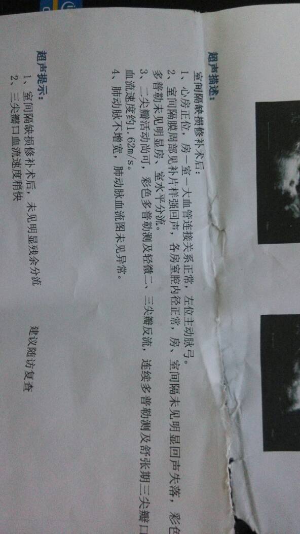 小宝宝心脏先天性心脏室缺,做完手术已经三个月了!到当地人民医院复诊,不知道彩超上面写什么 点击展开 匿名用户 2014-08-02 13:52 为您推荐: 其他回答 现在看着没有多大问题,最少在三个月或半年以后复查一个再看一看另外期间要注意观察孩子的情况不要让他太累了。 母婴用户470601239 2014-08-02 22:51 相关问题 您好!我家小孩出生42天了,由于频繁哭闹,就到当地的心血管医院检查,其心脏彩超提示:房室间隔缺损4 小宝宝反复发烧,要做心脏彩超,是什么原因 在当地卫生院顺产后一星期清宫,清宫时有出血现象,医生没继续下去直接换人民医院,人民医院做彩超发现子