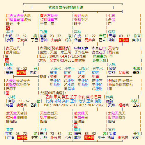 1983年4月17日15点15分上海市生男 紫薇盘如下 求解 点击展开 母婴用户120726482 2014-11-06 17:28 推荐回答 癸亥丙辰乙亥甲申癸丑大海水命印欺铜堡旺,惠玻会拖拉洞了。懒散。去年各方面运气涩滞,特别是情感事业方面。2010年更是喜忧参半。 匿名用户 2014-11-07 09:43 宝宝知道提示您:回答为网友贡献,仅供参考。 相关问题 1984年10月08日 香港出生男 和1983年12月15日 广州出生女 姻缘 你好!我的小孩五岁在2013年12月30日下午红星幼儿园放学17时30分左右,在福州仓山区盘屿市场 我是属猪的女(农历1983~2~15)老公是属猴的(1980~11~17),我们想生个宝宝,属什么的好?