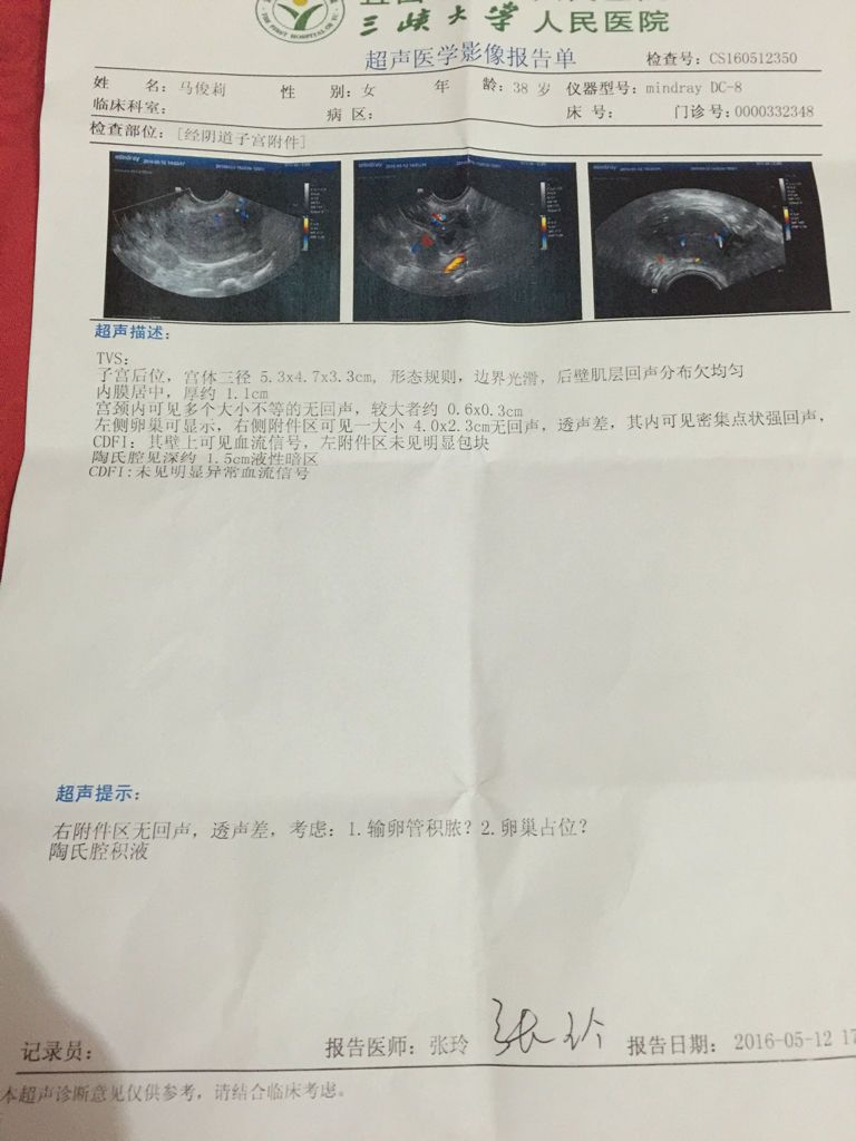 宜昌市第一医院左满珍 你好,右附件区无回声,透声差,输卵管积脓,卵巢占位,陶氏腔积液 这是我今天做 宜昌市第一医院左满珍你好,右附件区无回声,透声差,输卵管积脓,卵巢占位,陶氏腔积液。这是我今天做的彩超结果我需要怎样治疗我是今天在你那检查的17号病人,我检查出来的时候你已经走了。 点击展开 匿名用户 2016-05-12 21:53 为您推荐: 其他回答 毕竟也不年轻了,建议中药调理… 母醉巧_bf98 2016-05-13 03:53 沙发 植向秋_nXYc 2016-05-12 22:26 相关问题 人流清宫后b超显示左侧附件区可见2 0*1 9cm无回声,形态欠规则,陶氏腔可见1 1c 左侧附件区囊性包块(巧克力囊肿??) 右侧卵巢囊性回声(卵泡) 陶氏腔少量积液 医生怀疑是宫外孕左侧附件见1 6*1 5cm无回声区,轮廓清,内见0 7*0 6稍强回声 陶氏腔有