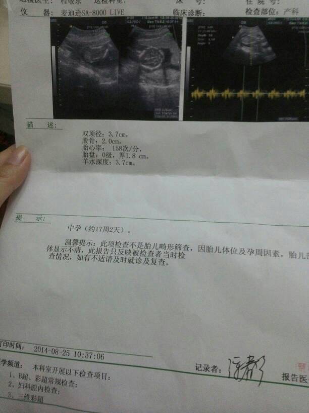 从b超检查结果看,胎儿发育在孕17周多(需结合自己的实际孕周分析),胎心率和羊水量在正常范围内,胎盘附着位置正常。