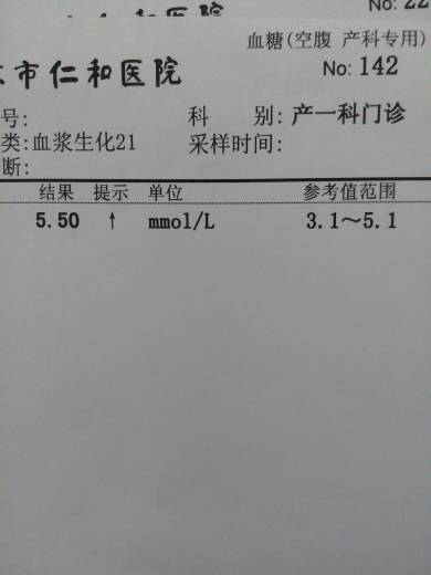 您好,人体胰岛素和血糖的调节是有时间的规律的,所有空腹血糖要在9点前完成。从您的的这个检查结果看,血糖有点高,正常成人的空腹血糖是3.89-6.11mmol/L,但是孕妇不能太高。建议您复查或者查一下OGTT实验,就是喝糖水测餐后血糖。门诊查应该就可以。