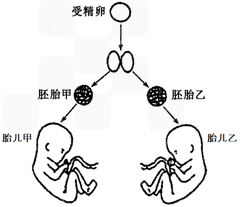 甲和乙为同卵双胞胎,其发育过程示意图如下,下列说法不正确的是 [ ] A.幼小的胚胎在发育过程中不会发生细胞的凋亡 B.甲患某种常染色体显性遗传病,乙正常,则可能是甲胚胎发生了基因突变 C.甲和乙在表现型上的差异主要是由基因重组导致的 D.若母亲为伴X显性遗传病患者,胎儿为男性时,需要对胎儿进行基因检测