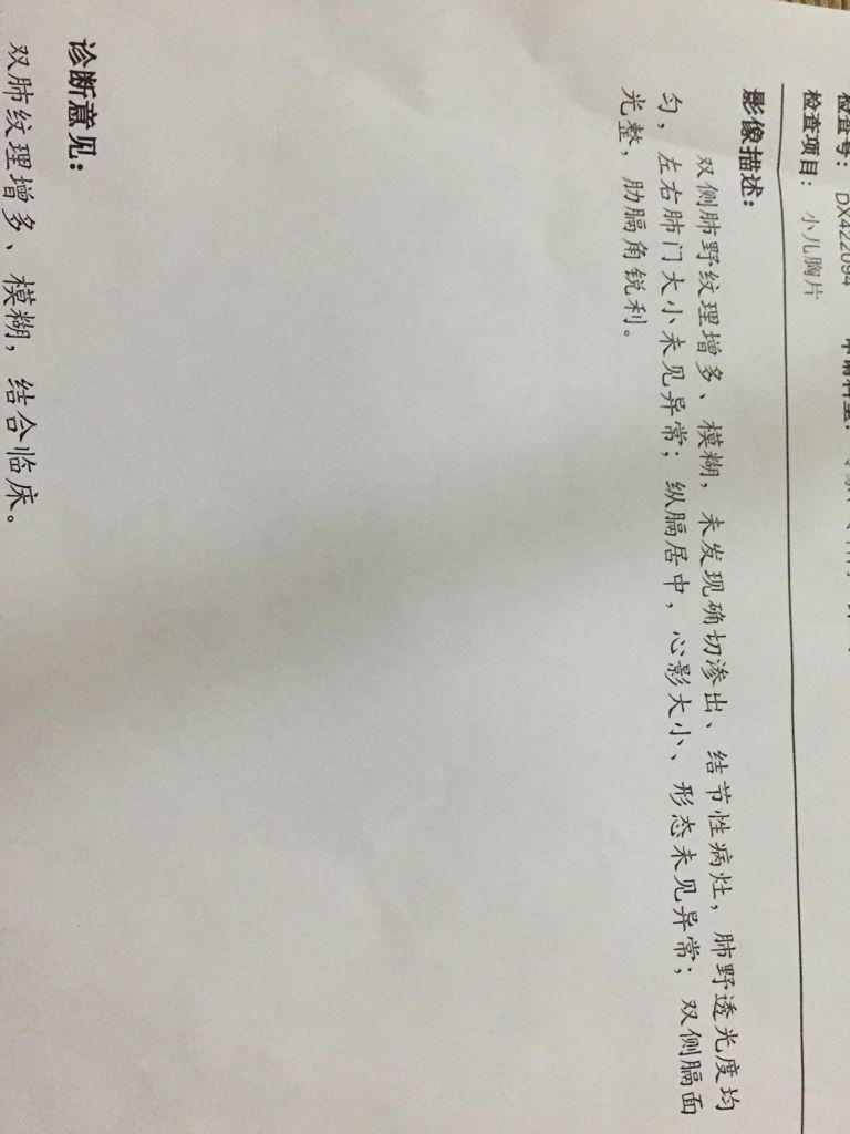 小孩咳嗽有两个月了,打了吊瓶和吃药后,现在偶尔咳一两声嗽,今天去检查了一下,片和检查验报告都在这里