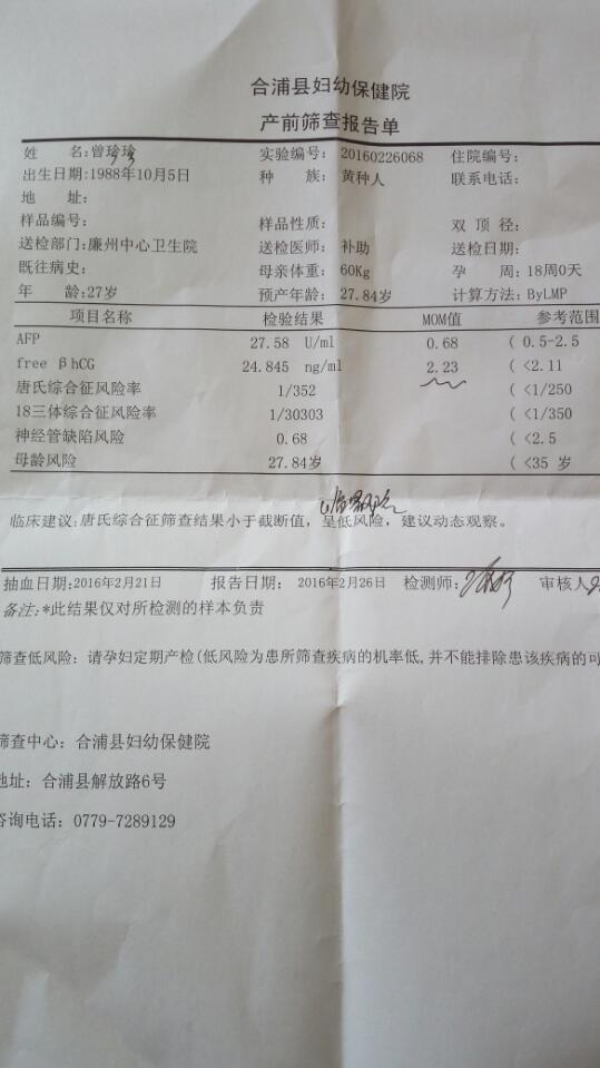 帮我看看这个唐筛单,担心 帮我看看这个唐筛单,担心 点击展开 夕颜ζ 2016-03-05 00:05 为您推荐: 其他回答 不客气,都是为了孩子,天下父母心 158*****829_O8qq 2016-03-05 22:47 你搜搜百度,看看这方面的文章 158*****829_O8qq 2016-03-05 00:35 听医生的! 嘟嘟LovE 2016-03-05 00:32 低风险,没事的 不是不追求,只是不强求! 2016-03-05 00:31 一般一周 cn#akVafQGfkV 2016-03-05 00:28 加载更多 相关问题 谁帮我看看这个唐筛检查单有没有问题啊! 今天去做唐筛了,有点贫血,医生说要多吃点西红柿,猪肝,结果要一个星期才能拿,宝妈帮我看看B超单,双 麻烦专业人士帮我看看唐筛化验单: 我今年38岁体重63 5公斤 孕周17周3天 AFP