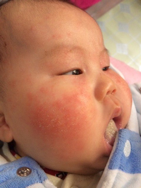 你这个应该是湿疹,好多婴儿都有的,常见的就是红肿,脱皮 起迦 渗水,面积还挺大,这个需要用纯中药的湿疹膏,像邦呗儿就不错,这个很容易复发