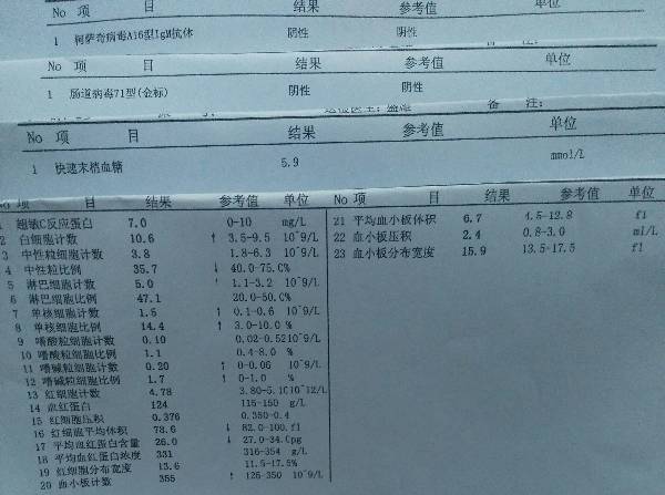 三岁孩子嘴角起了几个泡泡,有破皮渗水,嘴里有针眼大的小红点 去验 三岁孩子嘴角起了几个泡泡,有破皮渗水,嘴里有针眼大的小红点。去验血查了这些项目,能说明是手足口病吗? 点击展开 匿名用户 2016-06-06 18:38 满意回答 化验指标不支持手足口病。不过有感染,可以口服点抗生素治疗。 安平莹_t6e1 2016-06-06 18:52 宝宝知道提示您:回答为网友贡献,仅供参考。 相关问题 孩子嘴里腮帮有几个小白点,嘴角处有一堆小泡泡怎么了 龟头冠处有一排小泡泡特别的小和针眼那 宝宝扁桃体发炎 喉咙里是小泡泡样的 还发黄 嘴角有点红 嘴里边有的流血了 有点流黄色鼻涕 还有点咳