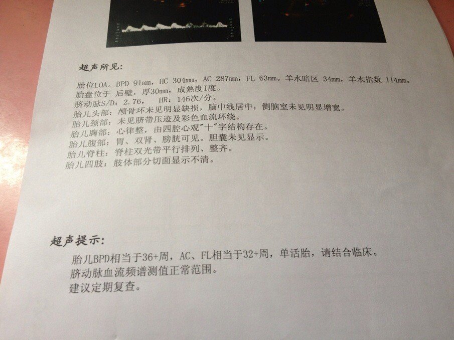胎儿BPD 91mm,AC 287mm,FL 63mm,HC 304mm,羊水暗区34mm,羊水指 数114mm 点击展开 匿名用户 2013-11-20 17:09 为您推荐: 其他回答 病情分析: BDP是双顶径,AC是腹围,FL是股骨长,你的情况还是可以的 指导意见: 只是孩子的发育下肢相对较短,但是不说明什么 匿名用户 2013-11-20 17:12 相关问题 bpd:91mm,ac:306mm,fl:69mm 羊水最大暗区:56mm,羊水指数:130mm 我怀孕刚刚36周,今天做B超说羊水最深值约:34MM 羊水指数约: 91MM 请问这属于正常吗 谢谢了 怀孕九个月b超显示bpd96,fl76,胎盘2级,羊水右上44,左上0,右下50,左下37是什么