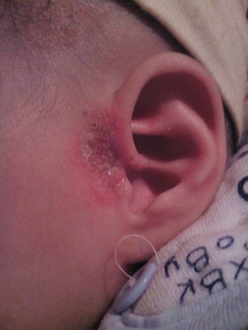 以你家宝宝的图片来看是由于脓疱疮导致的,这要是脓球菌感染导致,最好是给宝贝外用百多邦等消炎药治疗。 再就是用黄连,黄柏,黄芩,大黄,煅石膏,等分研极细末香油调涂。