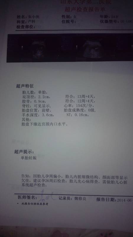 有懂的医生宝妈们给看看我的B超单吧,有没有事?谢谢! 有懂的医生宝妈们给看看我的B超单吧,有没有事?谢谢! 点击展开 世 世。 2014-06-24 15:03 为您推荐: 其他回答 不客气 ok天秤座10 2014-06-24 17:06 需卧床休息,以左侧卧位为佳,避免增加腹压,继续观察。 ok天秤座10 2014-06-24 15:35 哦 我是美女 2014-06-24 15:23 怎么不把上面那—照出来。 我是美女 2014-06-24 15:21 从B超单子上看,胎儿发育的很好,只是胎盘的位置有点低,继续观察。 ok天秤座10 2014-06-24 15:07 相关问题 宝妈们帮帮忙看看我的b超做的是男孩,还是女孩谢谢了!