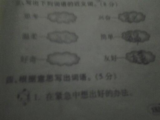 请学霸解决一下,好奇的近义词和第四题的第一小题 点击展开 匿名用户 2014-12-25 17:40 满意回答 看不清 匿名用户 2014-12-25 17:40 宝宝知道提示您:回答为网友贡献,仅供参考。 为您推荐: 其他回答 新奇,奇怪 在紧急情况中想出了好办法 匿名用户 2014-12-25 18:06 第四题第一个是急中生智,好奇的反义词是奇怪。 匿名用户 2014-12-25 17:43 好问 匿名用户 2014-12-25 17:43 思考的近义词是想像 温柔的近义词是温婉。 好奇的近义词是新奇。 匿名用户 2014-12-25 17:42 加载更多 相关问题 好奇的近义词是惊奇更对还是好问更正确 好奇,马虎,专心的近义词 好奇的近义词,同义词,反义词分别是什么