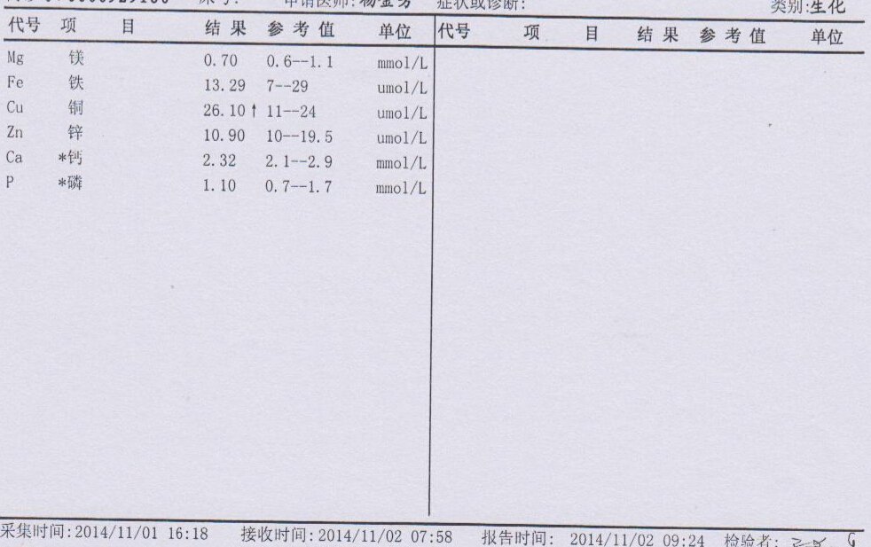 怀孕17周多做的血常规和微量元素 求助 年龄23 第一次怀孕 怀孕17周多点 刚做的血常规和微量元素 求助帮忙看看 好像铜有点高 后期怎样治疗 或者吃饭什么注意什么 点击展开 匿名用户 2014-11-02 10:55 相关问题 宝宝查血常规和微量元素后,结果微量元素都正常,但是血常规中有个"SF"的显示为17,而正常值是20 怀孕14周多 13周血常规白细胞偏高,要紧吗 我怀孕11周了,为什么这几天头晕的厉害怎么回事,难道是我身体不好,我去医院做血常规检查没有贫血呀