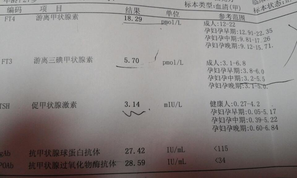 帮帮忙看一下!!!孕17周时游离甲状腺素18.29.正常值9.81-17.26,游离三典甲状腺素5