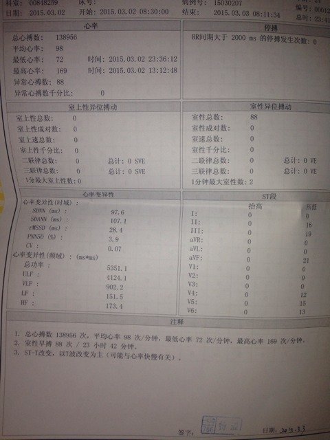 这是24小时的心电图报告,有懂的吗?帮我看看有问题吗? 这是24小时的心电图报告,有懂的吗?帮我看看有问题吗? 点击展开 hy 2015-03-09 15:19 为您推荐: 其他回答 你好,这个需要口服点减慢心率的药物 cn#BLQGQkGfpL 2015-03-10 17:53 你好,这个还是不正常的 cn#BLQGQkGfpL 2015-03-09 16:23 你好,这个动态心电图是有心动过速的问题,要注意是有什么原因导致的,如甲亢,心肌缺血还是由于口服抗心律失常的药物的问题 cn#BLQGQkGfpL 2015-03-09 15:38 应该正常现象 优雅公主👸 2015-03-09 15:28 祝你好孕? 因为爱你_PjlV 2015-03-09 15:19 相关问题 今天做的心电图,报告显示这样,看不懂~ 我的体检报告我看不懂,帮我看看有没有需要 我怀孕两个月21天时去医院照B超,能帮我看看检查报告有没有问题,胎儿有没有什么问题,我不懂