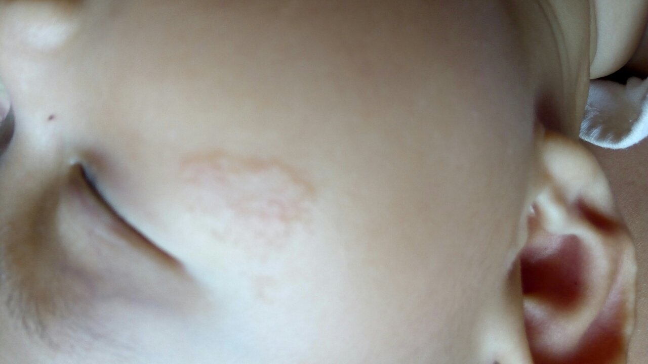 宝宝三个月了右眼下角长了一片好像藓一样的疤痕,都一个半月了刚开始没在意以为是蚊子现在越大越大,起皮