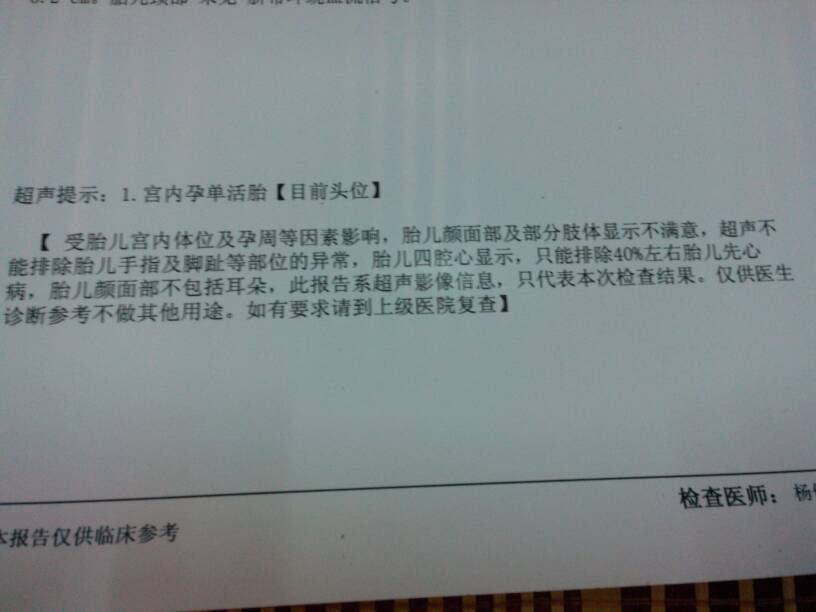 请专家解释,这样是我的宝宝不健康吗,这是8个月的时候的b超 请专家解释,这样是我的宝宝不健康吗,这是8个月的时候的b超 点击展开 寳鋇ル妖澈 2014-07-29 18:20 为您推荐: 其他回答 不客气 陈颖医生 2014-07-29 21:35 你好,下面括号起来的那些提示,是每一个晚期的B超单上面都有的,只是说大了面部这类看不清不是你家宝有问题不必担心 陈颖医生 2014-07-29 20:17 相关问题 怀孕6个月了 这是B超结果 大家帮我解释下 是否健康 我怀孕到现在八个月了,没做过四维也没做过彩超,做B超的时候医生说一切健康,不做那个宝宝会有事看不出 怀孕多久做B超才能检查宝宝是否健康呢?