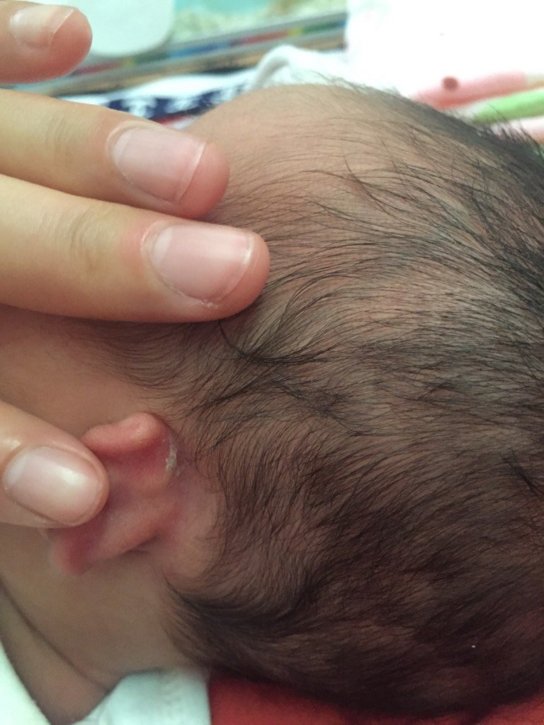 二十七天的宝宝左耳朵后面有白色小泡泡是怎么回事?知道的人回答,不知道的或者是让我去问医生的人,干脆