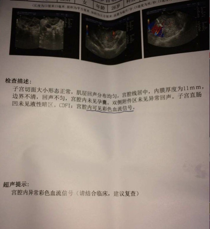 2月25号做的无痛人流,3月10号复查显示有残留14*11(这次人流之前怀过一次死胎,人流后也是有 残留清了两次宫都没清干净,后面医生开了妈富隆月经后好了)这次是直接让医生开的妈富隆,吃完后仍没来月经,自己买了一盒黄体铜吃完已经五天了,仍没来月经,中途有类似肉的物体流出,一直没有来月经,今天去医院检查,B超检查:子宫切面大小形态正常,肌层回声分布均匀,宫腔线居中,内膜厚度为11MM,边界不清,回声不匀,宫腔内未见孕囊,双侧附件区未见异常回声,子宫直肠未见液性暗区,FDFI:宫腔内可见彩色血流信号。超声提示:宫腔内异常彩色血液信号。。验血。孕酮0。43,人绒毛膜促性腺激素17.19。。。附照片,请各位医生帮忙看看,这种情况该怎么治疗好,谢谢 !!! 点击展开 匿名用户 2014-04-15 20:00 为您推荐: 其他回答 病情分析: 您好;你的情况除了残留, 指导意见: 感染因素和子宫收缩不良都可能引起这样的情况,您在明确检查以后可以遵医嘱治疗 赫亦凝_2Vv0 2014-04-15 20:29 相关问题 我是去年做了三次无痛人流后七个月怀孕的,可是三个月去医院检查是死胎,我很想要个宝宝,再次怀孕需要… 做40多天死胎用无痛人流方法有什么危险吗 死胎可以做无痛人流吗