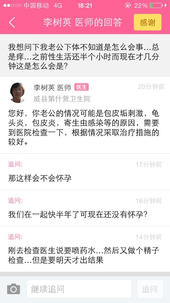 我老公下体不知道怎么会是很痒挠的很了还出一些豆豆特痒…之前性生活半个小时而现在才几分钟了…这样精子 我老公下体不知道怎么会是很痒挠的很了还出一些豆豆特痒…之前性生活半个小时而现在才几分钟了…这样精子射进去会怀孕吗?精子好吗?有没有细菌? 点击展开 18738707750 2014-07-23 18:26 为您推荐: 其他回答 你好,你这个情况最好是让他去检查一下的看看是什么原因引起的?然后买一些药膏来涂抹一下的, 可靠的悠闲80 2014-07-23 22:29 相关问题 女人流产后下体出现小豆豆还很痒,还会出现异味是什么原因 宝宝下体因为纸尿裤出了好多小豆豆,每天晚上宝宝都用手挠,估计很痒 有性生活之后就没有了,吃过避孕药后面来月经都推迟了而已下体长了小豆痒 请问这是得了妇科病了吗