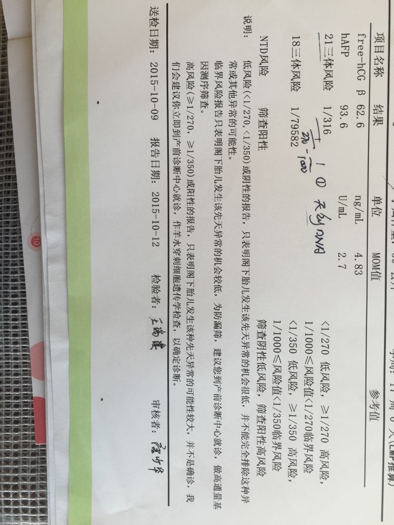 求看的懂唐氏孕中期产前报告单的说明下 点击展开 匿名用户 2015-10-16 10:25 满意回答 你好,你的化验单属于评狼次低风险,先天异常的几率低,建议,营养均衡,适了司当运动,增眨吉强体质,按时产检,检测胎心胎动,左侧卧位,有利于血液循环,如有不适及时就诊,补血补钙。 cn#BaGaaLfLaV 2015-10-16 11:03 宝宝知道提示您:回答为网友贡献,仅供参考。 相关问题 孕中期产前筛查是唐氏筛查吗?那晚期还要做筛查吗? 末次月月经是2015年1月22日,但是月经不规律,5月26日唐氏征产前筛查报告单上孕周是15周加5 求看的懂唐氏孕中期产前报告单的说明下