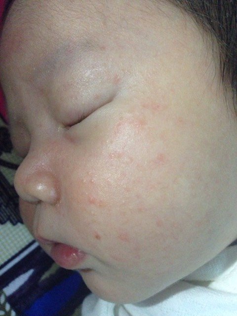 宝宝现在满月+5天,脸上长了一些疹子,已经有近两周时间了,没有消退,热的时候发红,有的疹子发红有白