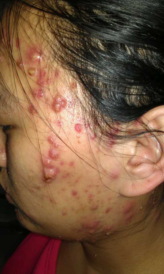 求大夫帮我诊断一下,我从怀孕7个月开始脸上长痘(有的叫痤疮,闷头)又疼又痒还很大,生完孩子之后更严