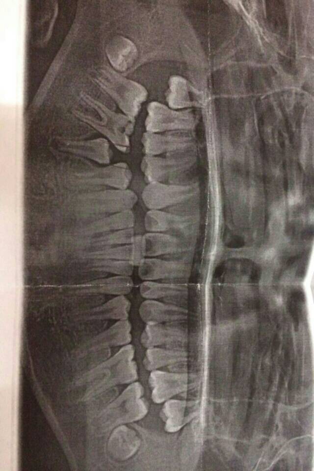 孩子十三岁,有三颗牙,左右两颗呈倒v排列,挡住了中间的牙齿生长,请教专家或网友该怎样治疗 由于