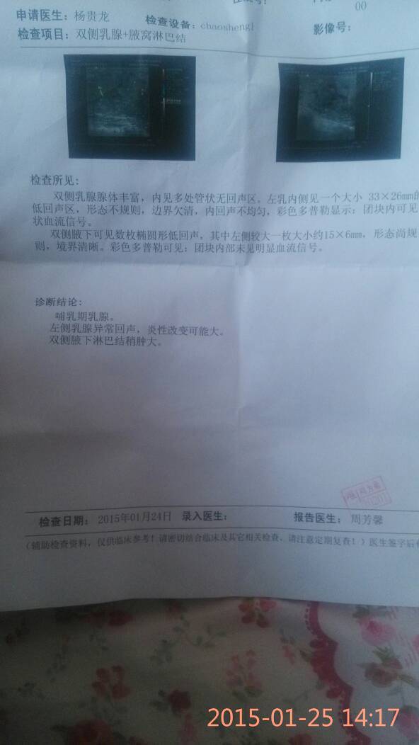 哪位医生帮我看这b超单子是什么意思 哪位医生帮我看这b超单子是什么意思 点击展开 _N9qm 2015-01-25 14:41 为您推荐: 其他回答 你好!你的报告单显示你左侧乳腺可能有炎症,腋下有淋巴结肿大,应该是你的炎症引起的,有炎症可能是由于乳汁堆积造成的,希望我的回答能帮助到你。 hjl黄山 2015-01-25 21:12 你当时就要问医生,是不是有问题,怎么治疗好! 🍁❤💃 2015-01-25 16:59 是不是得乳腺炎了 147*****898_IO0P 2015-01-25 14:59 相关问题 拿B超单子让医生看,医生知道男女吗 请问医生唐筛是按末次月经还是按b超单子哪个更准啊 各位宝妈们和专家,帮忙看下这个B超单子!怎么说比末次月经算的要大呢?医生说都有4个月了…我才16