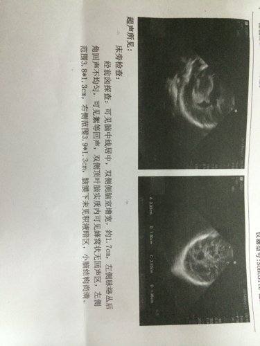 早产儿,一个月,查头颅超声,显示结果,一共两次,前者5月27照的,后面的图是5月31照的,想问下从 早产儿,一个月,查头颅超声,显示结果,一共两次,前者5月27照的,后面的图是5月31照的,想问下从这个结果来看,孩子脑部会有问题么 点击展开 匿名用户 2014-06-05 13:47 为您推荐: 其他回答 你好,检查结果直接给医生看就好的,如果有什么问题的话会告知的,不需要担心的,祝宝健康 可靠的悠闲80 2014-06-07 13:10 相关问题 早产儿两个月做头颅CT检查诊断 一岁九个月早产儿宝宝头颅有囊肿要动手术吗?多少钱? 一岁九个月早产儿宝宝头颅有囊肿动手术要多少钱