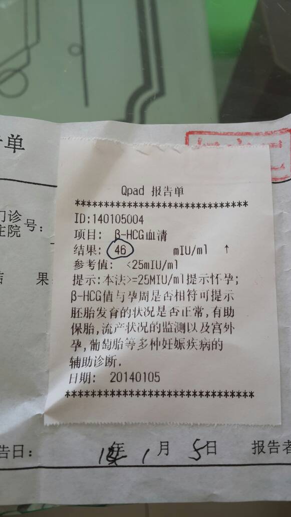 月经前4天用验孕棒一深一浅,验血报告图 这是怀孕了吗? 点击展开 `` 随遇而安 ﹏℡ 2014-01-05 12:34 为您推荐: 其他回答 病情分析: 你好,从你检查结果来看,是怀孕了。 指导意见: 你等到怀孕50天就去医院做产检,没有什么问题。 匿名用户 2014-01-05 14:12 相关问题 月经14天没来用验孕棒显示一深一浅是不是怀孕了 我月经已经推迟8天了,验孕棒显示是怀孕了,但是我只是腰酸,小腹阵痛,胸部胀痛,但是我没有妊娠纹啊? 末次月经是2014年4月10号 4月23号有过一次同房 这个月月经没来,5月20号用验孕棒验出怀孕
