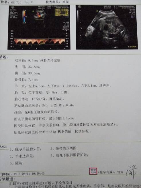 孕41+1双顶径:9.6cm;颅骨光环完整头围:33.3cm腹围:33.5股骨长:7.4 孕41+1双顶径:9.6cm;颅骨光环完整头围:33.3cm腹围:33.5股骨长:7.4cm羊水:左上5.6cm,左下0、右上2.6、右下5.1,透声差胎盘:位于前壁,厚4.8cm,Ⅱ度。胎心博动:157次/分,可见胎动。脐动脉血流频谱:s/d:2.26,ri:0.56颈部:见W 型压迹及血流信号胎儿下腹部肠管扩张,最大间距1.52cm因手胎儿位置、羊水关系影响,胎儿颜面及肢体等未见完全清晰显示胎儿体重测值约3295+-481g宫缩不明显,胎心正常医生建议可以考虑刺激,看结果,胎儿无法承受就刨宫产。纠结中,能否给点意见 点击展开 houjunfly 2015-08-11 23:31 为您推荐: 其他回答 打催产针了没 小禹厚的妈妈 2015-08-12 13:04 正常,,。六斤二 小禹厚的妈妈 2015-08-12 13:02 听医生的. 依然,放不下_xRxq 2015-08-12 01:37 听医生的,, 爱伊贝贝 2015-08-12 00:05 咨询下医生的意见 SHOWW 2015-08-11 23:50 加载更多 相关问题 双顶径93mm,腹围356mm,股骨71mm,颅骨光环完整 孕85天,B超显示胎儿颅骨光环不完整,这正常吗? 超声所见:17 5w 超声孕周18 0w 增大的宫腔内见一成型胎儿回声 颅骨光环完