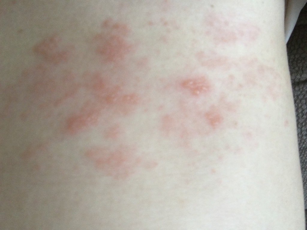 昨天去拍婚纱照,结果拍完脱了礼服发现左胸肋骨下方起了成片的红色疙瘩还有水泡,现在怀孕八周也敢乱用药