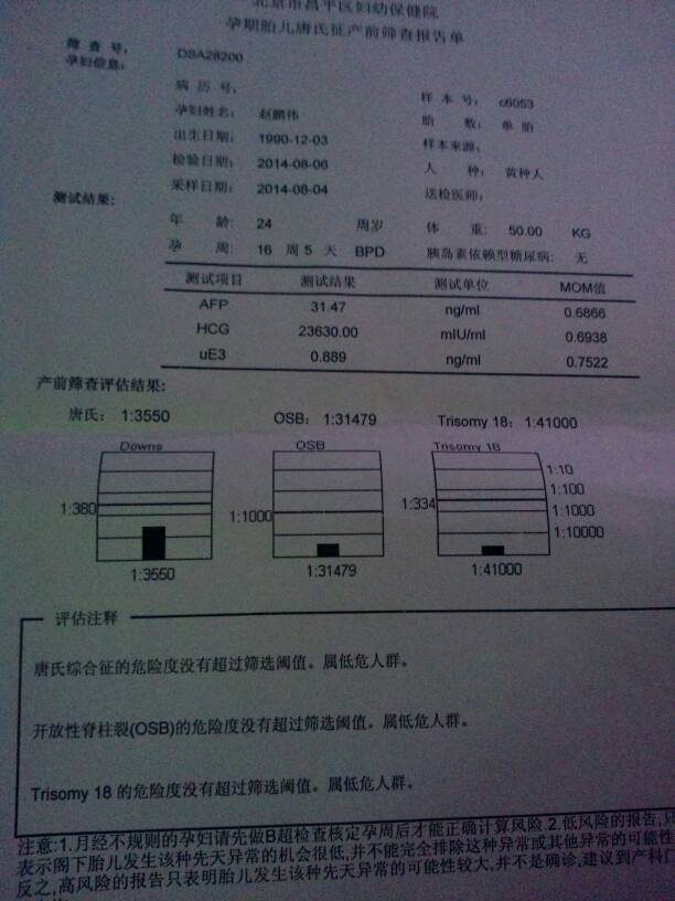 帮我看看唐筛的结果正常吗 帮我看看唐筛的结果正常吗 点击展开 海豚公主 2014-09-20 16:46 为您推荐: 其他回答 这个也只是筛查了目前比较常见的病,没有什么问题。 hlmcm8 2014-09-20 17:07 看了你的几项检查,都是低危人群,也就是患这些疾病的可能性很小。没什么。 hlmcm8 2014-09-20 16:47 相关问题 刚拿回来的唐筛结果,帮我看看正常不!! 跪求专家帮我看看此唐筛检查结果怎样 末次月经推算孕周16+2实际应该在18周左右当时填错了! 请大家帮我看看唐筛结果中的甲胎蛋白和人绒毛膜促性激素是否正常?谢谢谢谢!谢谢大家了!