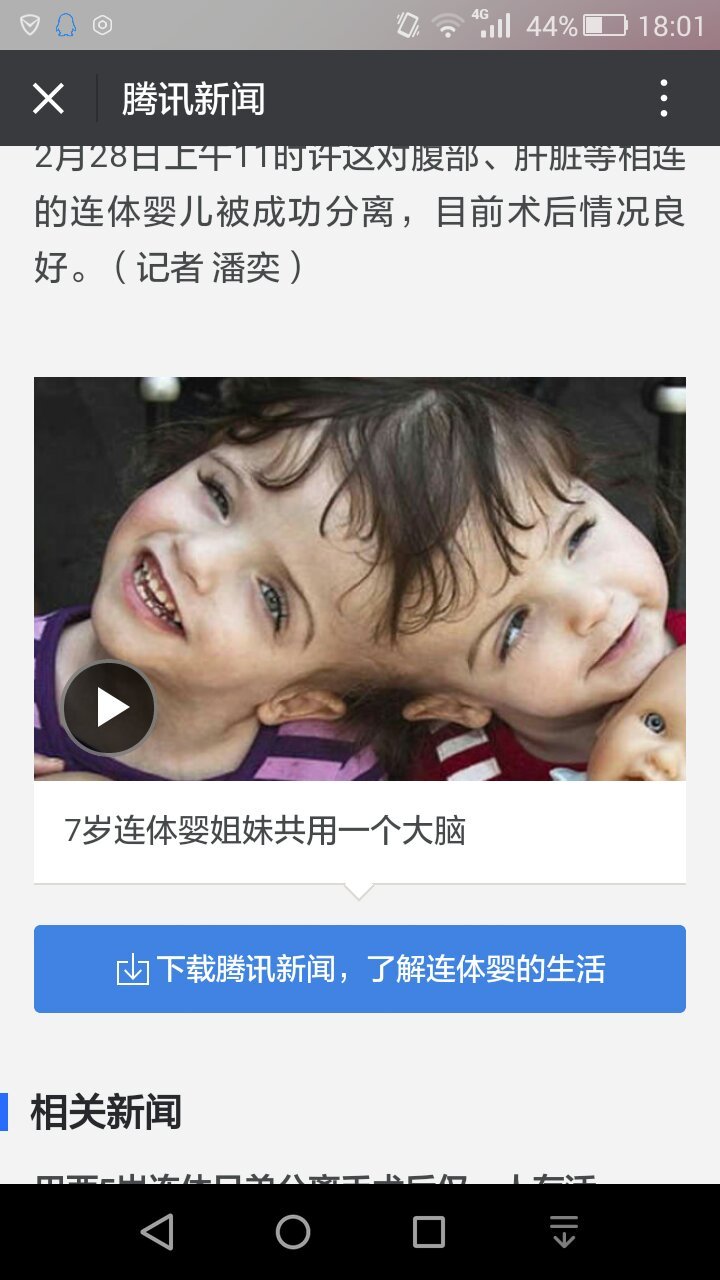 什么出生的婴儿是两个人用一个大脑 腾讯新闻⊙▽⊙ 点击展开 匿名用户 2016-03-01 18:06 为您推荐: 其他回答 连体 匿名用户 2016-03-02 07:36 连体儿 匿名用户 2016-03-01 18:13 连体 奉修洁_iYrl 2016-03-01 18:06 相关问题 看腾讯新闻上好多孩子出生后有问题,好担心宝宝的健康 怎么样让宝宝上腾讯新闻 怎样让宝宝上腾讯新闻