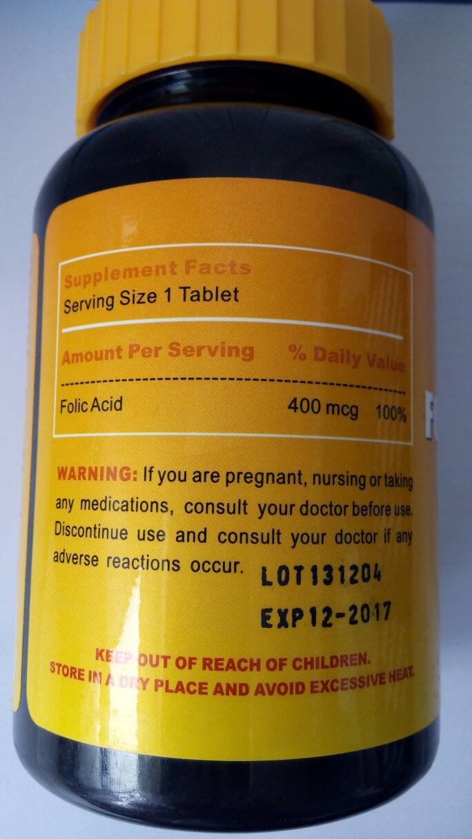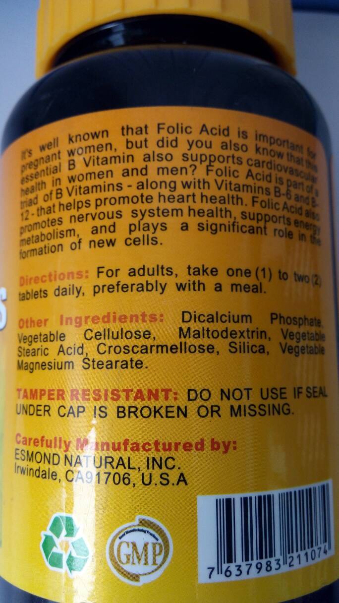 每天一到两片,饭中吃,品牌应该叫esmond natural。上面一段都是说叶酸怎么怎么好,富含什么什么,最下面的warning是如果你怀孕,在被护理或者药物治疗,要在吃之前咨询医生。有不良反应立刻停止服用。最下面红字:放在儿童碰不到的地方,避光避热避湿