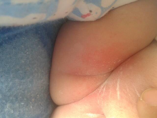 宝宝这两天大腿下两边缝隙有点红红的、怎么办、请各位宝妈给点意见、宝宝才两个月