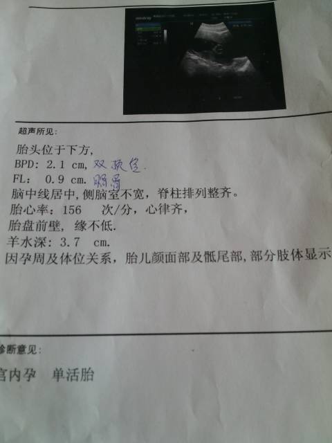 怀孕刚三个月,双顶径2.1cm,股骨0.9cm,胎心率156次/分,羊水深3.7cm,抬头位于下方 怀孕刚三个月,双顶径2.1cm,股骨0.9cm,胎心率156次/分,羊水深3.7cm,抬头位于下方,正常么 点击展开 未来与你 2015-03-27 11:34 为您推荐: 其他回答 挺好的哦, 百度用户#_CUYk 2015-03-27 14:25 正常。。。 家有俩宝贝真幸福 2015-03-27 13:37 正常,可能是个女宝 小美美麻麻 2015-03-27 13:26 正常。。。。 少靓舒晴 2015-03-27 13:24 应该正常,, 露露小姐🌸 2015-03-27 12:41 加载更多 相关问题 我17周零三天今天做的B超双顶径3 7cm,股骨长2 1cm,胎心率148次/分,胎盘位于后壁,属于正常吗?求宝妈帮助 宫内中孕,单胎,双顶经2 1cm 胎心率158次一分,律齐,股骨长0 9cm,胎盘位于后壁,羊水深 宫内中孕,单胎,双顶经2 1cm 胎心率158次一分,律齐,股骨长0 9cm,胎盘位于后壁,羊水深