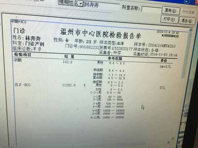 老婆怀孕了,抽血体检报告单,清医生看下 怀孕6周多几天,,今天早上出了一点褐色的血有没关系 点击展开 匿名用户 2014-11-04 17:31 为您推荐: 其他回答 你好,这些数值是可以的,无论现在有无阴道出血、腹痛等症状,怀孕6-8周时主张到医院进行B超检查,确诊是否为宫内妊娠。 张笑珠 2014-11-05 09:37 相关问题 我自己测试怀孕了,去医院抽血检查报告拿出来医生下班了,不知道结果好不好?雌二醇 3494 00 怀孕8周抽血检查孕酮!结果很低,医生建议让我打针,我该怎么办?孕酮低会有什么影响?求解! 我怀孕一个多月了、昨天肚子突然疼、去医院急诊、超声、抽血都做了、医生说没事、但是回来之后又疼一夜阿