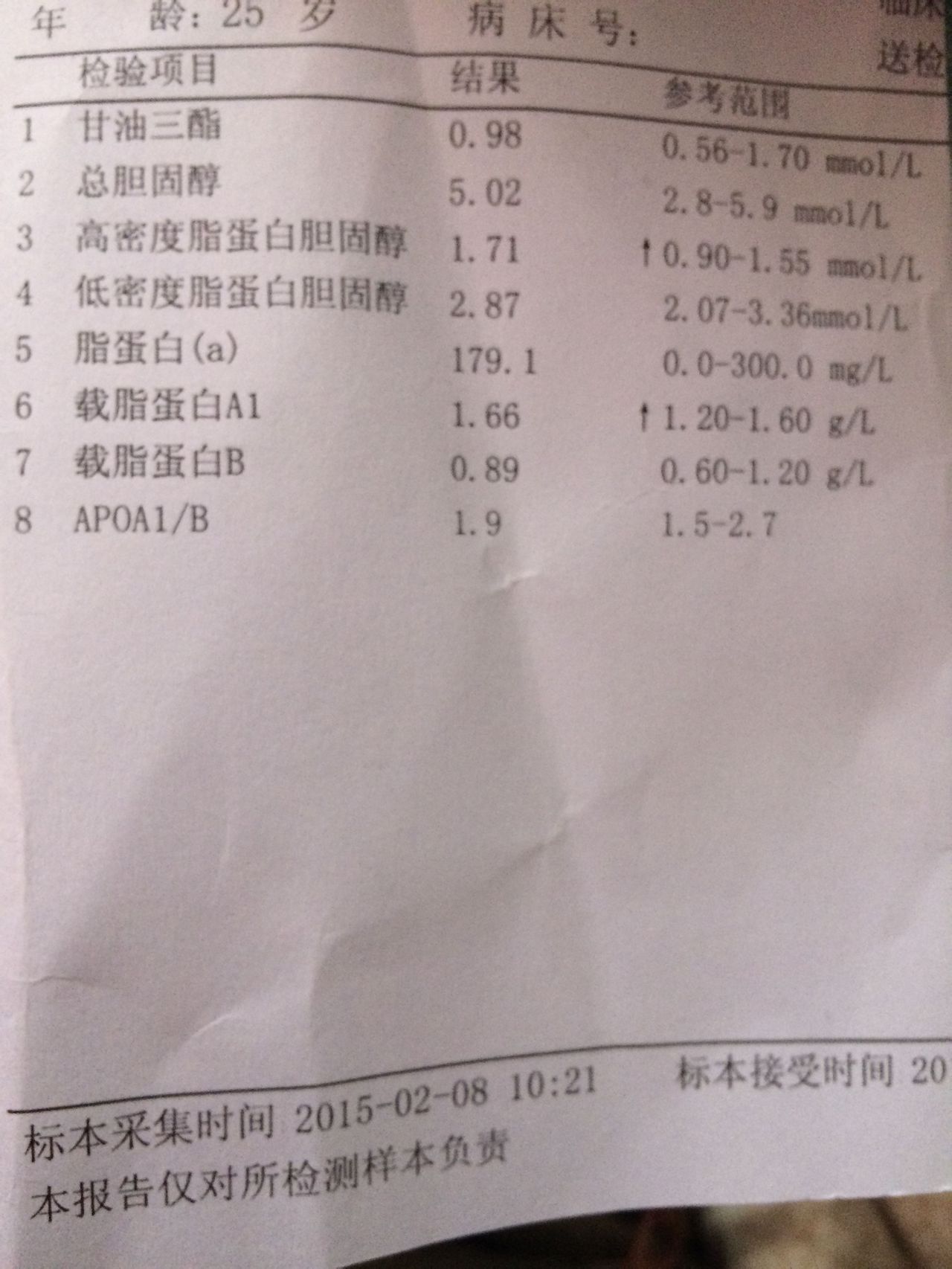 本人女,26岁,偏胖,检查不孕症,血脂检查高密度脂蛋白胆固醇和载蛋白A1偏高是什么意思? 点击展开 匿名用户 2015-02-08 15:55 为您推荐: 其他回答 高密度脂蛋白胆固醇和载脂蛋白A1,这两项是好的胆固醇,越高越好,说明您的血脂代谢功能非常好。 ZohnYang 2015-02-08 16:16 相关问题 检查血脂四项仅高密度脂蛋白胆固醇0 76? 男,两岁,阴离子间隙16 6-总蛋白59 2/球蛋白16 1/肌酐29 4/高密度脂蛋白胆固醇0 孕妇总胆固醇喝甘油三酯和高密度脂蛋白都高 但是白蛋白低!