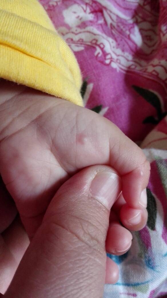 请大家帮忙看看,小宝宝手上的这两个肉色的小疙瘩是什么东西呀,左边一个已经好几天了,右边一个是新长的