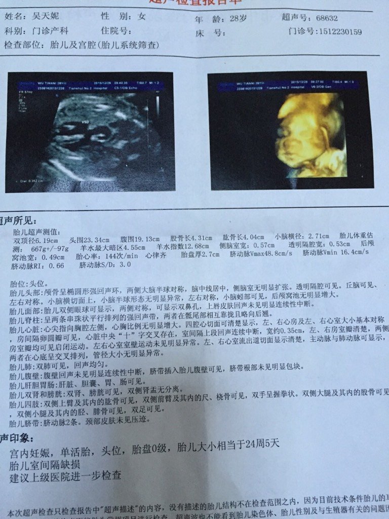 怀孕24周做系统B超时,检查结果显示胎儿心脏室间隔缺损0.35cm,其它包括心率144,都是正常的 怀孕24周做系统B超时,检查结果显示胎儿心脏室间隔缺损0.35cm,其它包括心率144,都是正常的,想问问医生这种情况在孕周中需要注意什么,这个病对胎儿出生后影响大不大?还需要在近期做哪些进一步的检查?胎儿室间隔缺损 点击展开 艾凌舞北 2015-12-29 18:47 为您推荐: 其他回答 你的检查结果没有问题 ˿5784 2016-01-01 14:45 不清楚。。 生生胜_DhuD 2015-12-29 19:19 没事。。。 歆语心愿 2015-12-29 19:17 这个得问大夫的 然丫头 2015-12-29 19:14 问问... 🌚就叫小黑吧 2015-12-29 19:08 加载更多 相关问题 26周彩超显示胎儿心脏室间隔缺损 我小孩五岁,医院检查出先天室间隔缺损0 35CM,有朋友告我一偏方,每天吃活癞蛤蟆心脏4只,两年可痊愈,请 我怀孕37周,B超单上显双顶径=86MM,股骨长=66MM,肱骨长=55MM,胎儿心率136次/分,律齐 胎盘厚度=26MM