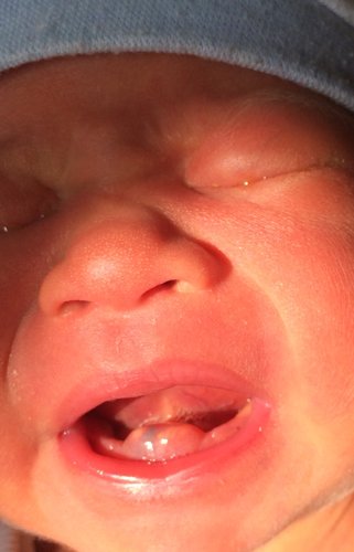我家宝宝一出生下门牙牙根处就长有突出肉块,大概7毫米长3毫米宽!肉块内侧左边为暗红色,右侧为米黄色