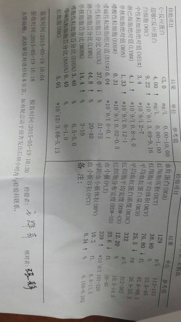孩子半岁,8公斤,体温在37-38.3徘徊,流清涕,神志清,精神欠佳,咽部充血,扁桃体1度肿大,双 孩子半岁,8公斤,体温在37-38.3徘徊,流清涕,神志清,精神欠佳,咽部充血,扁桃体1度肿大,双肺呼吸音粗,可闻及少许痰鸣,心腹未见异常(以上是代夫的描述),图片是验血结果,麻烦医师诊断孩子病情,及该吃什么药,谢谢 点击展开 jphcarnation 2015-05-20 21:31 为您推荐: 其他回答 祝宝宝健康 现实很~骨感~ 2015-05-20 22:19 急疹出过吗 第一次发烧百分之80是急疹 善为至宝 2015-05-20 21:48 祝宝妈幸福! 凡轩妈咪 2015-05-20 21:44 相关问题 体温39·8度精神可咽充血两侧扁桃体1°大双肺… 孩子扁桃体化脓四天了,已经输液三天,第二天输液因为体温在38 5-38 9之间,所以加用地塞米松一 准备这个月7号八号的要孩子,可是今天发烧了,体温38 7,左侧扁桃体肿疼,全身部分关节、肌肉疼,尤