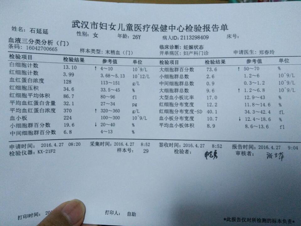 各位专家你们好!我末次月经11月10号,现在怀孕24周,前面检查都还挺顺利,今天去做了血糖检查,结果出来后医生说白细胞偏高,然后又让我验了C反应蛋白结果是正常的!请问专家对宝宝真的没影响吗?这个验出来的白细胞 各位专家你们好!我末次月经11月10号,现在怀孕24周,前面检查都还挺顺利,今天去做了血糖检查,结果出来后医生说白细胞偏高,然后又让我验了C反应蛋白结果是正常的!请问专家对宝宝真的没影响吗?这个验出来的白细胞是我的还是宝宝的了?还有其他的好几项有的偏高或偏低,这是怎么回事?对宝宝的神经系统发育有没有影响? 点击展开 石延延 2016-05-04 10:17 为您推荐: 其他回答 没事的别担心 159*****711_ab4N 2016-05-04 13:41 s lou t 159*****543_mecB 2016-05-04 13:41 问下医生。。。 宋宋妈妈 2016-05-04 13:40 听医生的! 依心伊逸 2016-05-04 13:40 不知道,, 快乐,happy 2016-05-04 13:26 加载更多 相关问题 孕34周左右尿常规显示尿蛋白1+尿酮1+尿血糖1+白细胞1+隔天白细胞阴性,只是小圆上皮细胞4 2(0-3),病理管型0 82(0-0 5) 医生让吊消炎针 我老婆怀孕18周了,上个礼拜在医院做产检,医生说白细胞增多,有炎症,白带检查后医生说有宫颈糜烂,我 我怀孕期血糖高,医生诊断说我是妊娠糖尿糖,现在生完宝宝45天了,空腹血糖和4小时后的血糖都正常,2