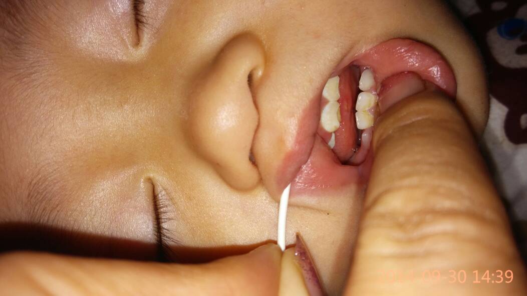 宝贝14个月了,最近发现他门牙和门牙下面两颗牙齿发黄,而且门牙表面层掉了一小块,这是什么原因呢?会